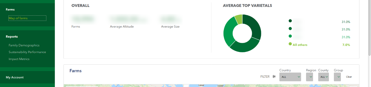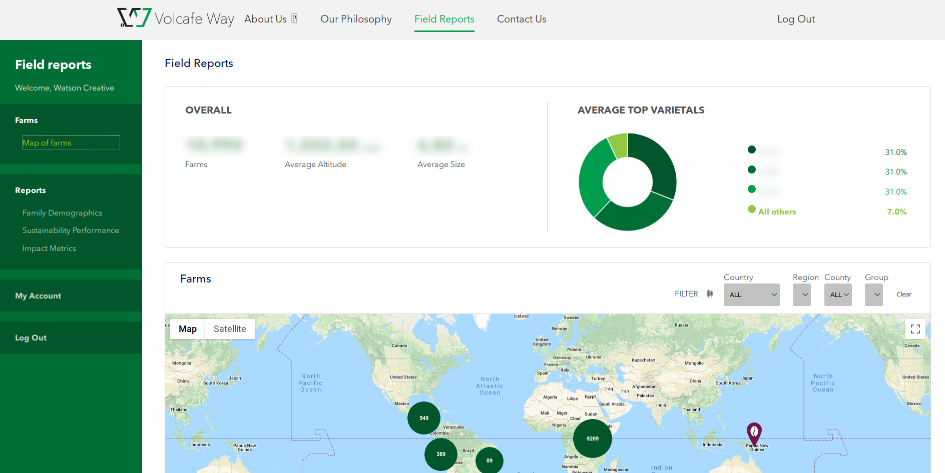 Reporting application for exploring demographic, environmental, and financial metrics about coffee growers around the world. Project primary is the Watson Creative agency, providing design and specifications.